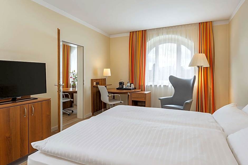 These spacious rooms range from 16-26 square-yards in size, are fitted with natural colors and come with carpeted floors, air conditioning, a mini-bar, satellite TV, street or park views, and coffee and tea making facilities. In addition, they feature a bathroom with a shower or bathtub, and a hairdryer. Bathrobes and slippers are provided on request.